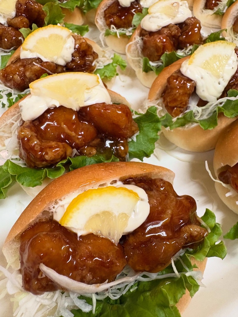 ジューシーな唐揚げに甘酢ダレとタルタルソースをのせて仕上げました!
