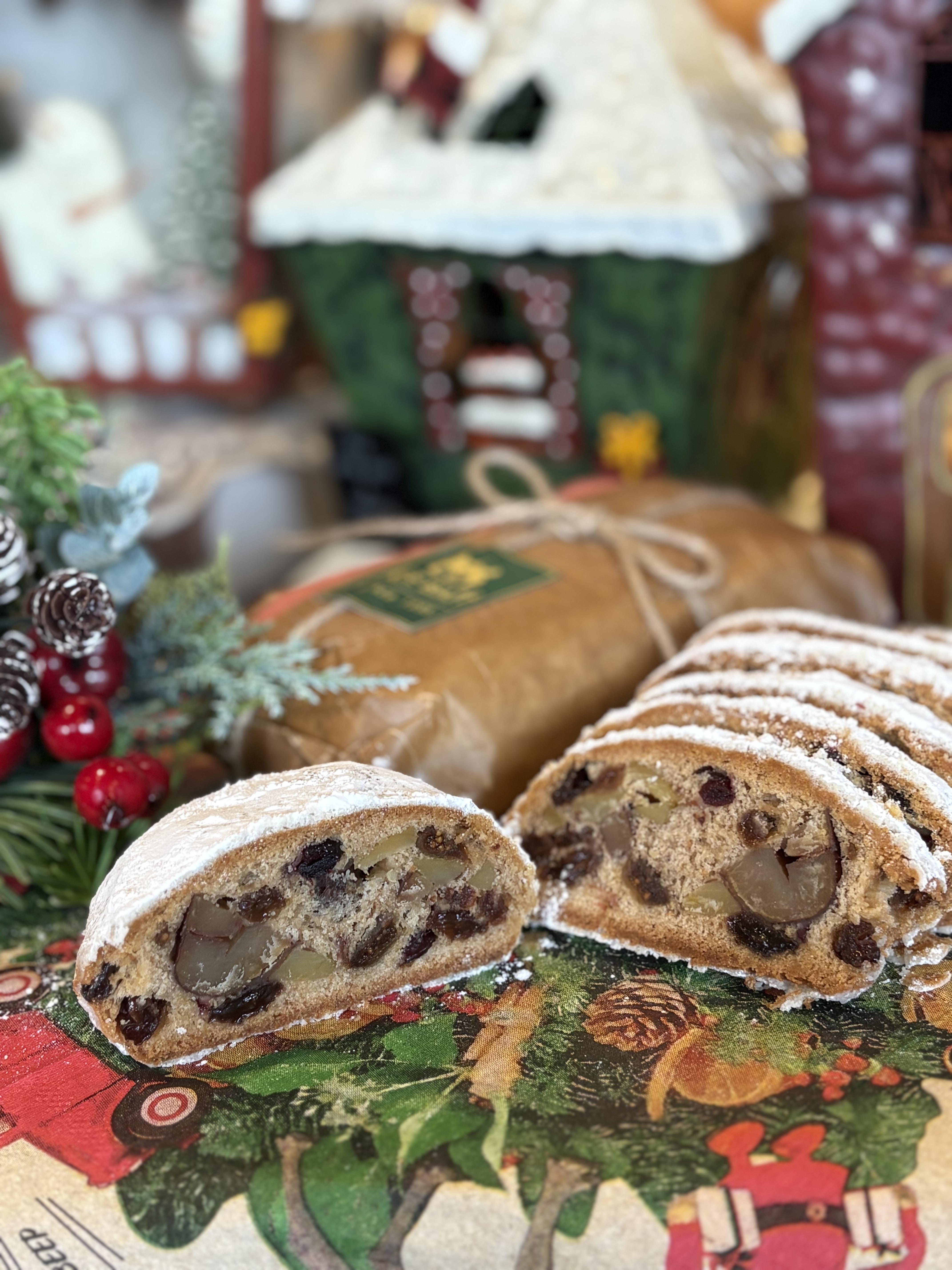 ラム酒漬けした栗、いちじく、クランベリー、レーズンをふんだんに入れ、スパイスの効いた生地で包んだ大人向けのシュトーレンです!