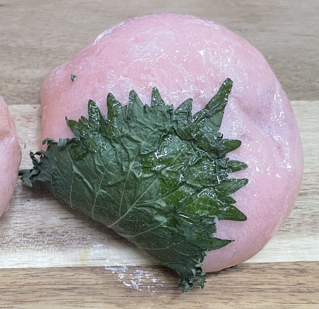 もちもち生地に道明寺餡とつぶあんを入れて大葉で包んで焼き上げました!