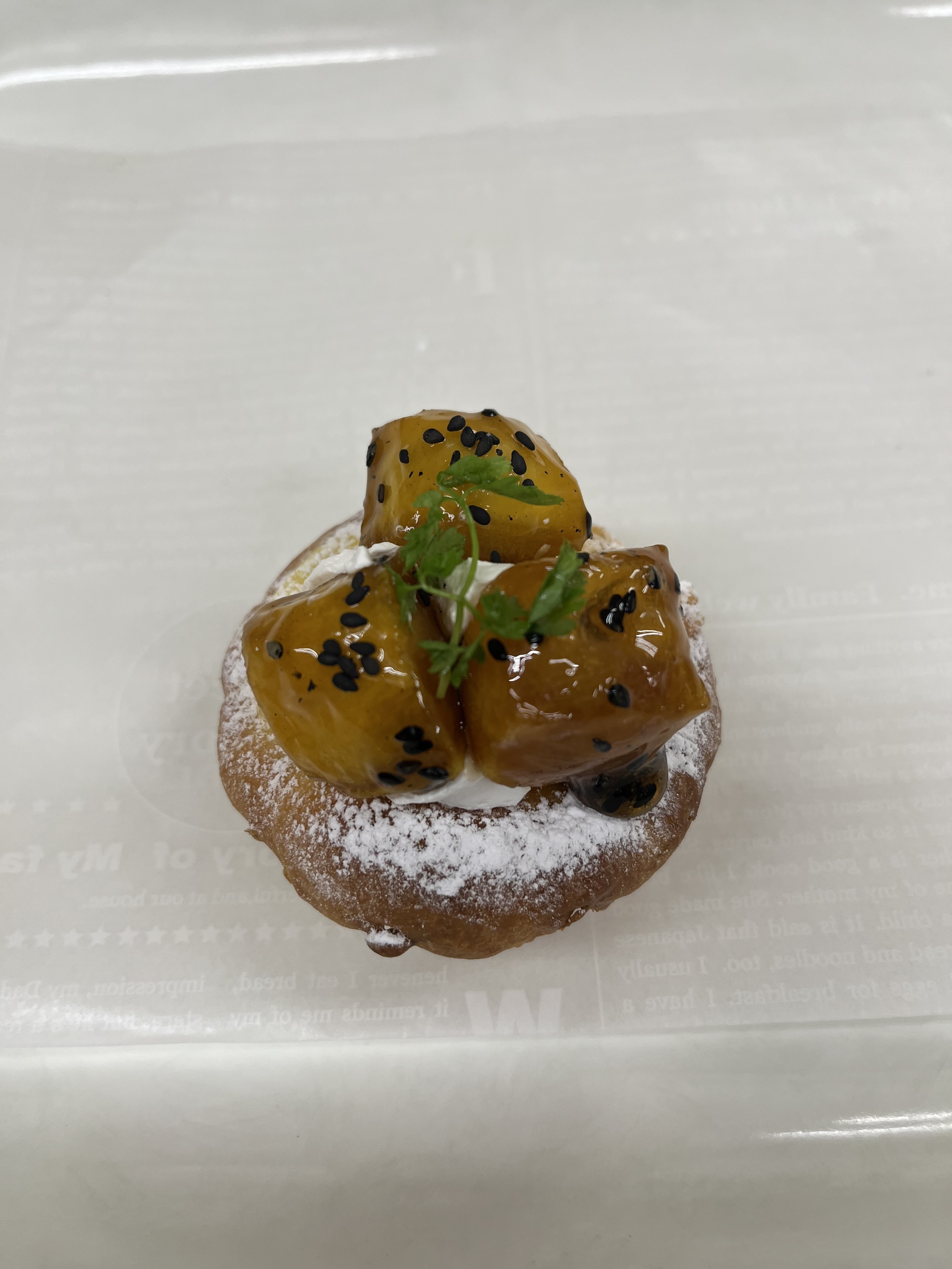 帽子パンに自家製カスタード、キャラメリーゼしたリンゴ、シルクスイートの芋が入ってます。